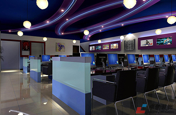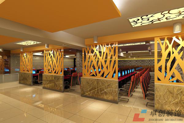 網(wǎng)吧的墻面宜采用較為樸素的設計或者素色的造型設計,以便突出經營的主體——電腦設備。一些游戲廣告、食品飲料運營商對網(wǎng)吧裝修的介入,不僅可以節(jié)約墻面裝飾的費用還能給業(yè)主一些額外的實惠,所以如果能找到一些貼近網(wǎng)吧主題的游戲廣告做成整幅的墻面噴繪也是一種不錯的選擇。但切記不應為了裝飾而裝飾,不應貪圖廣告小利,按納不合時宜的廣告而破壞了裝修的整體效果。