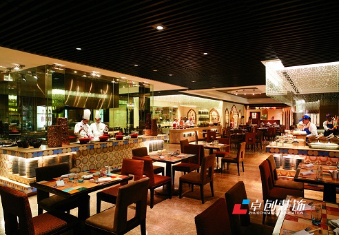 卓創裝飾教大家如何合理的安排這些區域,西餐廳設計最主要的工作。幾個區域即互相連通,又各不影響,交通路線非常自由,設置在南側的景觀區,使景觀各個區域都欣賞得到,空間隔而不透。